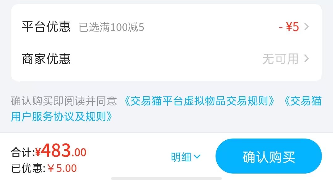 其他平台可能承诺给各位商家的是在七天到十天之内如果用户不确认收货的话将会自动打款,但是都没有像交易猫这样直接绑定支付宝快,甚至还有的要繁琐的绑定银行卡,提现不仅有手续费还要自己担付,本来平台还要抽手续费,一顿卖号折腾自己就挣了一顿饭钱,真的没必要,选择交易猫最多四天的收款周期以及直接打到支付宝余额真的非常专业。