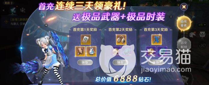 第三天咱们把68元的首充用掉,随便买月卡还是什么,总的来说即便买月卡也就买一个月,其实月卡给的东西获取难度都不大,如果你不是天天玩的话,没必要买,第三天充完以后更重要的是领连续充值礼包,这是咱们可以切到奖励界面把这个礼包的三天奖励都领掉,又是外观又是武器又是材料,非常有用,到后面即使不充钱玩也无所谓了。