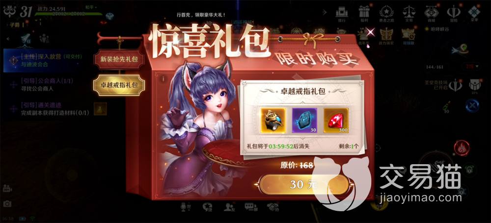 首先充值界面就在游戏的右上角,打开商城点击充值就可以进行付费,前提是要手机绑定了指定的支付方式,这里就不为大家赘述了。在新手期的话咱们充值就买一个卓越戒指礼包,只需30元就给一个橙装还是比较划算的,还会有300红钻和一些材料。至于新装抢先礼包的话,没必要去买都是一些外观方面的东西,这个礼包在进游戏第一天就会开启倒计时,如果过了新手期就会恢复原价168,这个礼包只能购买一次。
