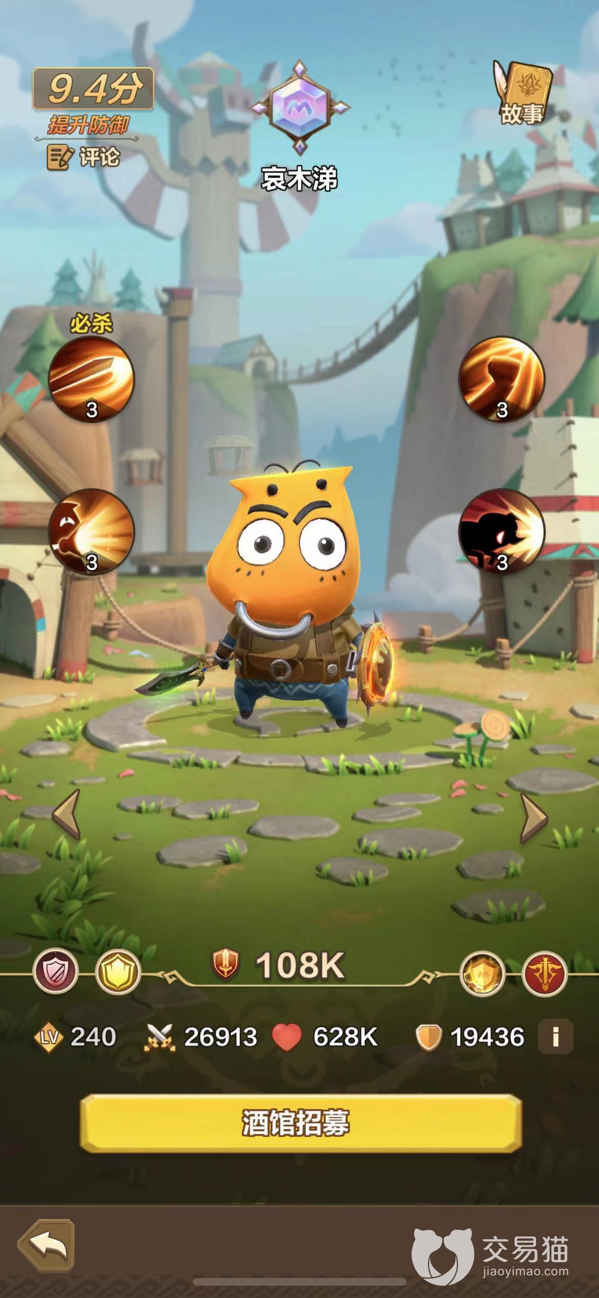 有难同当:是一个辅助类型的技能,野德新之助会选择一个英雄守护对方,在守护期间敌人攻击该角色的伤害会分摊百分之三十给野德新之助,并且在释放这个技能的时候野德新之助也会回复一部分怒气值。
