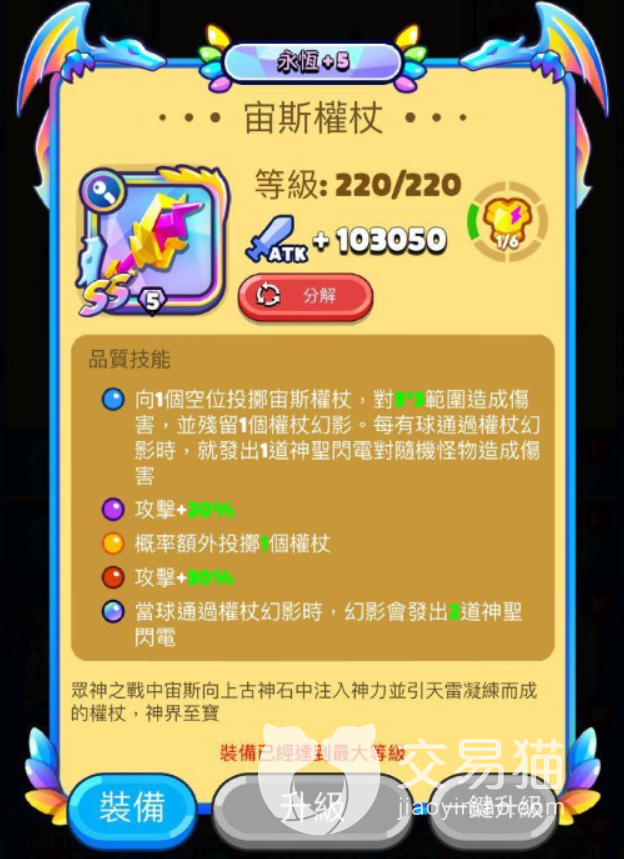 第一件装备先说武器名叫宙斯权杖最高等级可以达到惊人的220级,作为六神装之一武器技能肯定要好好说一下。蓝色技能向空位投射出宙斯权杖,投射出去之后会大范围对投射方造成伤害并且在空中留下一个法杖的残影。这个残影的作用还不小,玩家们只需要对着残影发射球球,球球擦到残影或是穿过。残影就会对这目前场内有的任何怪物造成强烈伤害。