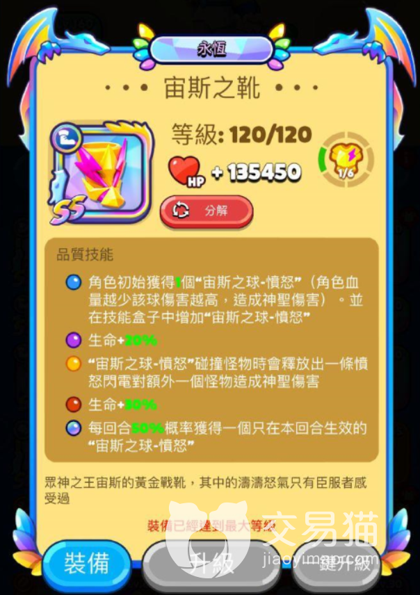 宙斯之靴作为鞋子那么肯定要发挥鞋子的作用,这双鞋子会给主角增加百分之20到30的生命并且还会增加主角发射出球的移速。只要主角的血量越少能打出来的伤害也就越高,这种情况就可以属于是只要主角伤到位装备出手什么怪物都能干碎。