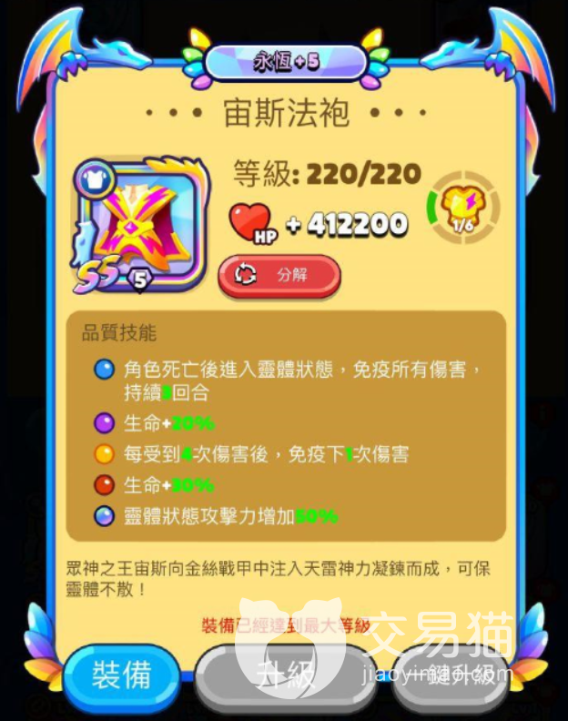 介绍到现在最重要的穿在身上的衣服还没有说,不要急这不就来了吗!宙斯法袍就是玩家们心心念念的衣服,这件衣服主要的作用就是防御。蓝色技能比较逆天,角色死亡之后游戏不会结束并且主角会变成灵魂体的状态免疫掉怪物后续打来的全部伤害保持三回合。紫色和红色各自为主角增加百分之20到30的生命值。橙色技能就简单粗暴了,每被伤害四次第五次伤害无论多强直接免疫。第五回就是无敌了这意思。彩色技能是为了灵魂体设定了,玩家成为灵魂体之后仍然是可以进行攻击的,那么成为灵魂体后攻击会大幅度等到上升增加百分之50的攻击力。