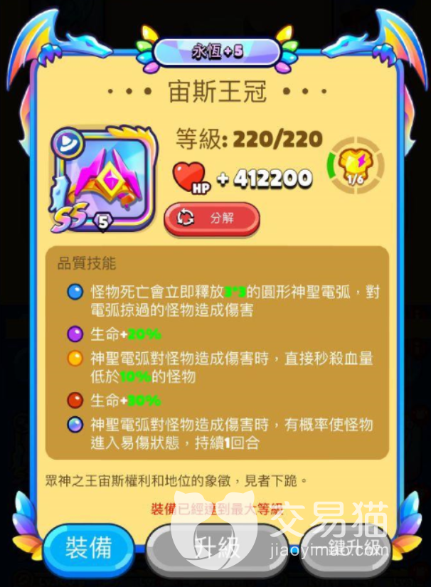 宙斯王冠,这个SS装备既然是带在头上的肯定是不能马虎的,这个装备穿上身之后就有了残血收割秒杀的能力,还增加了自己的伤害。橙色技能在给怪物造成伤害之后,怪物的血量一旦低于百分之十则被立即秒杀。主角这边则会有血量的提升。这个王冠的介绍是说王冠是身份地位的象征,见者下跪。