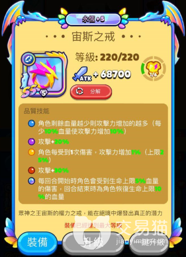 接下来给大家介绍戒指,名叫宙斯之戒。蓝色技能在主角血量受到伤害后增加攻击力,受到多少伤害增加多少攻击力。紫色增加百分之20攻击,橙色主角被打一次攻击力增加百分之一,红色攻击增加了百分之30。彩色技能只要玩家被伤害咱们就直接回血。这个戒指不愧是六神装之一。