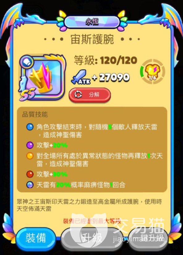 接下来给大家介绍宙斯护腕,这个装备穿在身上的技能总的概括就是有攻有守。并且还能在技能释放之后麻痹控制场上的怪物一回合,为主角赢得机会,逆转战局。基本技能释放叫做天雷。
