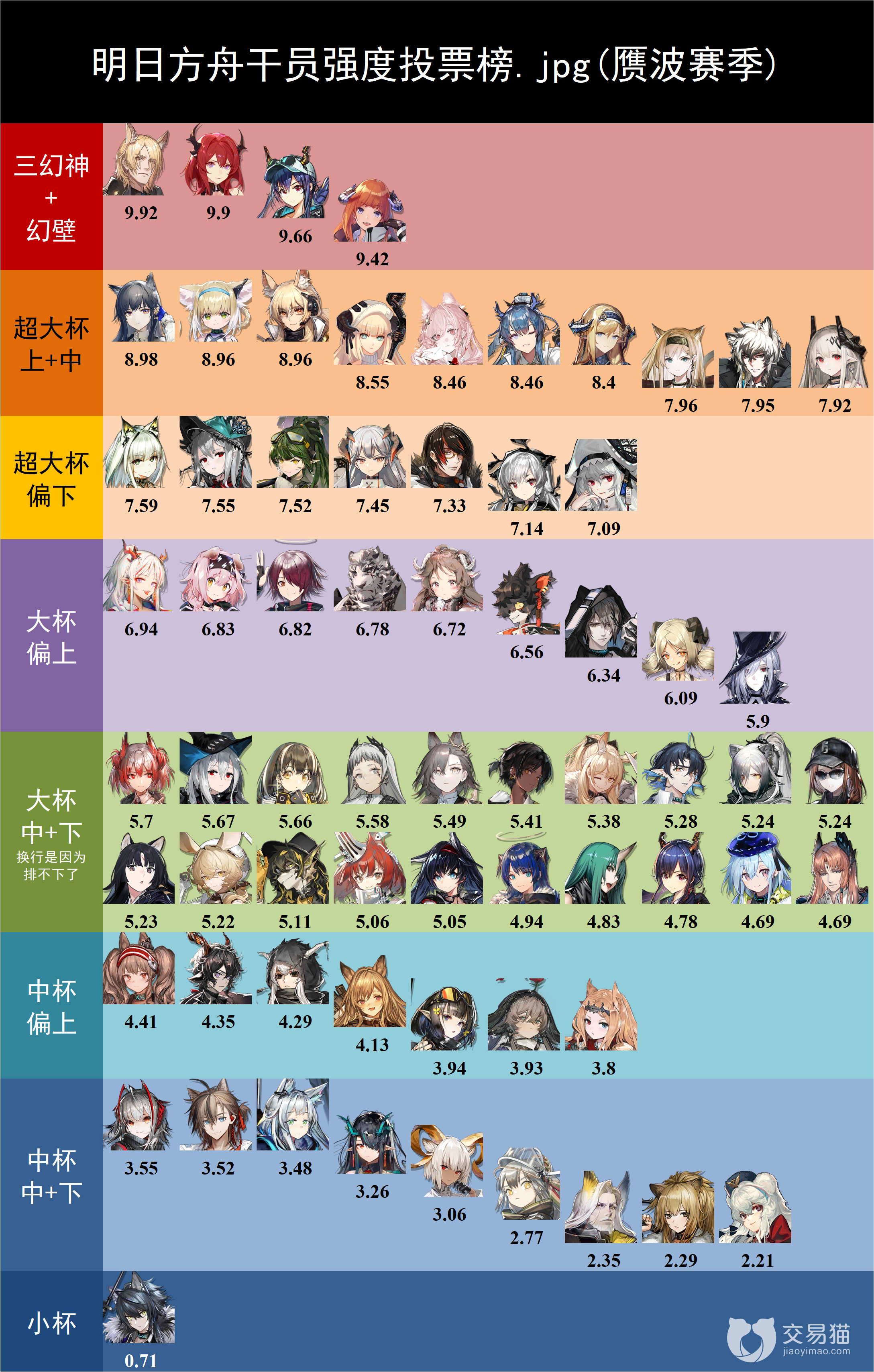 以下就是赝波行动后版本,也就是近期重大活动之后的所有表现成员评分。表现较为出众的也就是三幻神了,除了银灰地位有所变动,但其他的主力成员依然不落于下风。