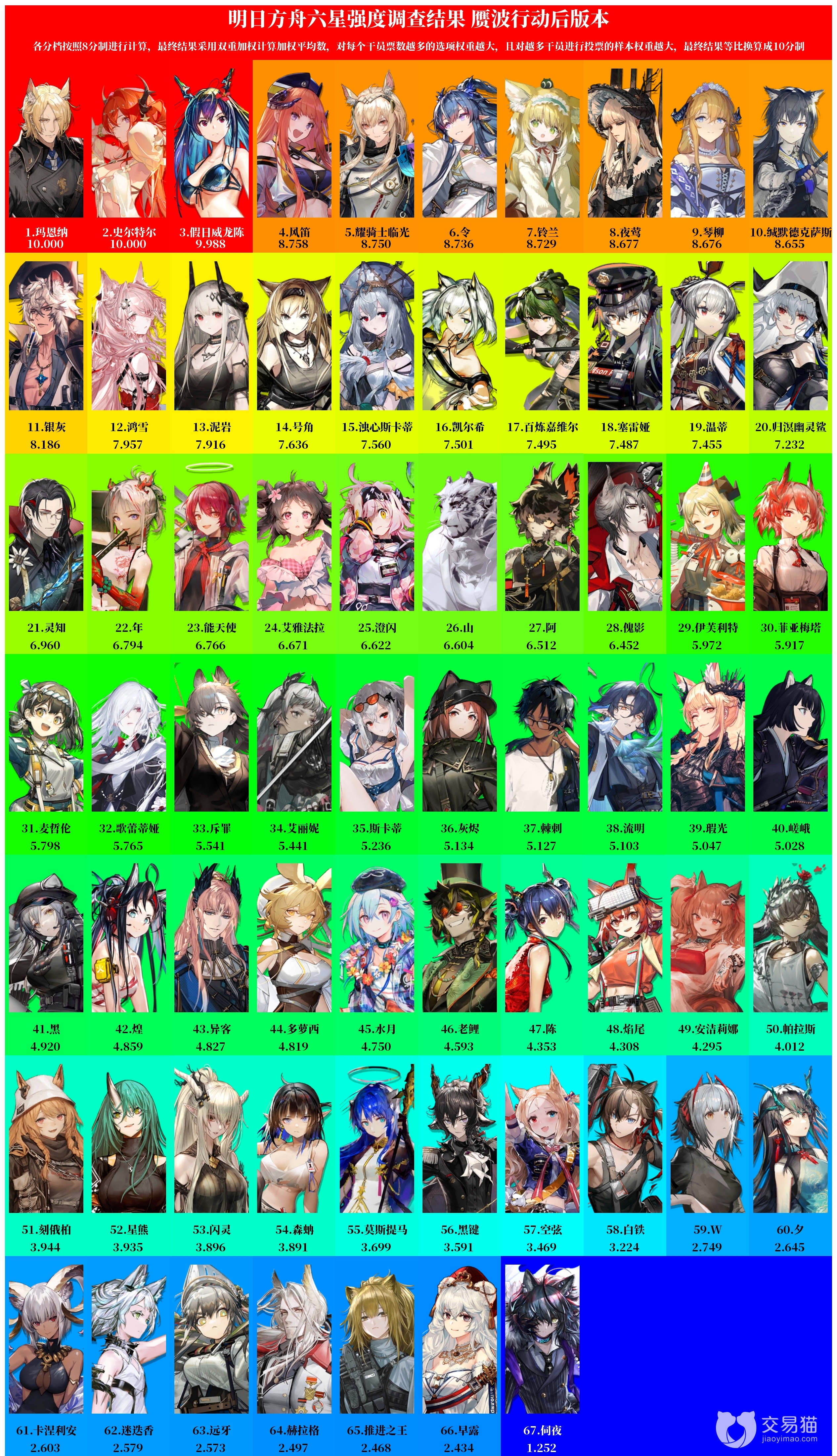 好了,以上就是小编尽可能提供的所有数据了,明日方舟六星强度榜一览就分享到这了。如果本篇对您有所帮助的话,可以多多关注我们的交易猫平台哟,我们后续还会更新更多的精彩攻略及资讯,正等着您来参阅哟。