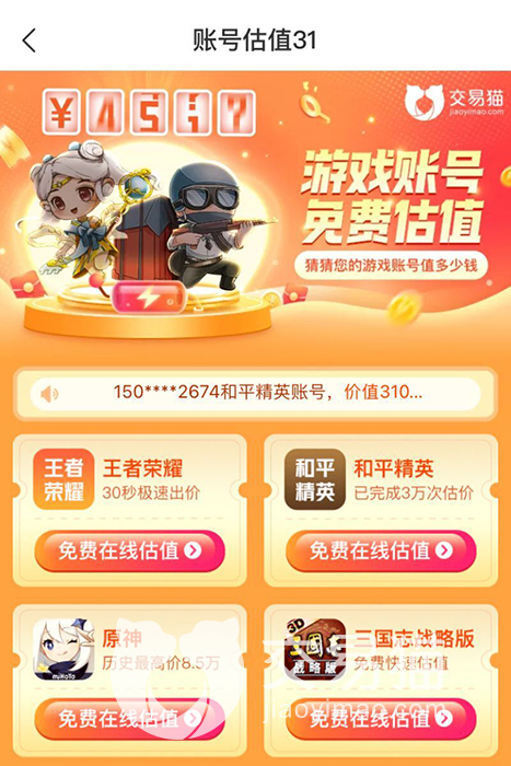 第一种,免费估值。打开交易猫的首页,选择我的页面,点击最下方的免费估值。玩家选定相关游戏之后,参与账号免费估值。