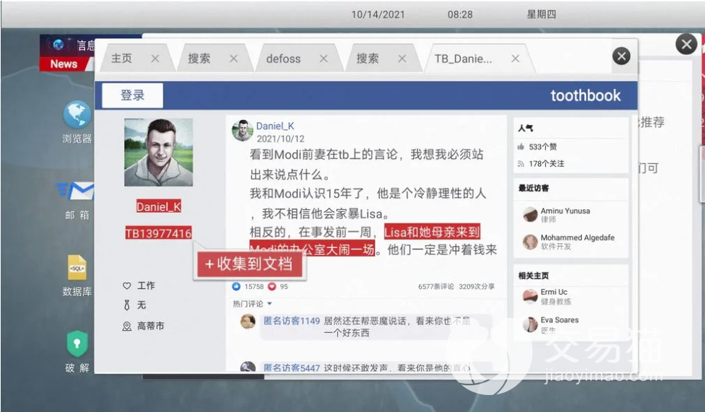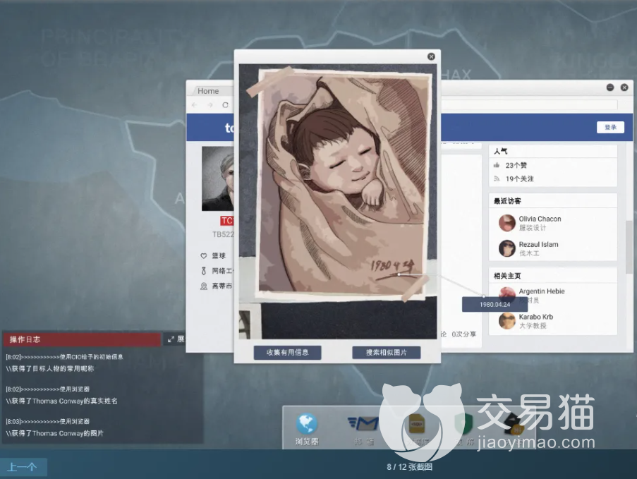 玩家在进入游戏之后点击链接Kapil Modi然后界面会出来新目标Toothbook,然后根据游戏中的各种提示得知该目标的真实名字是【Thomas Conway】,这个时候玩家需要继续往下翻找动态就可以收集获得婴儿的照片。找到该信息之后在文档中打开照片点击收集,在得到出生日期之后就可以返回桌面找到数据库,在数据库中根据现在的所有信息查询目标人物的个人信息。最后通过破解将名字拖入选择信息导入生成密码,然后使用邮件进入伪装状态与对方进行对话,然后收集秘钥提交信息。
