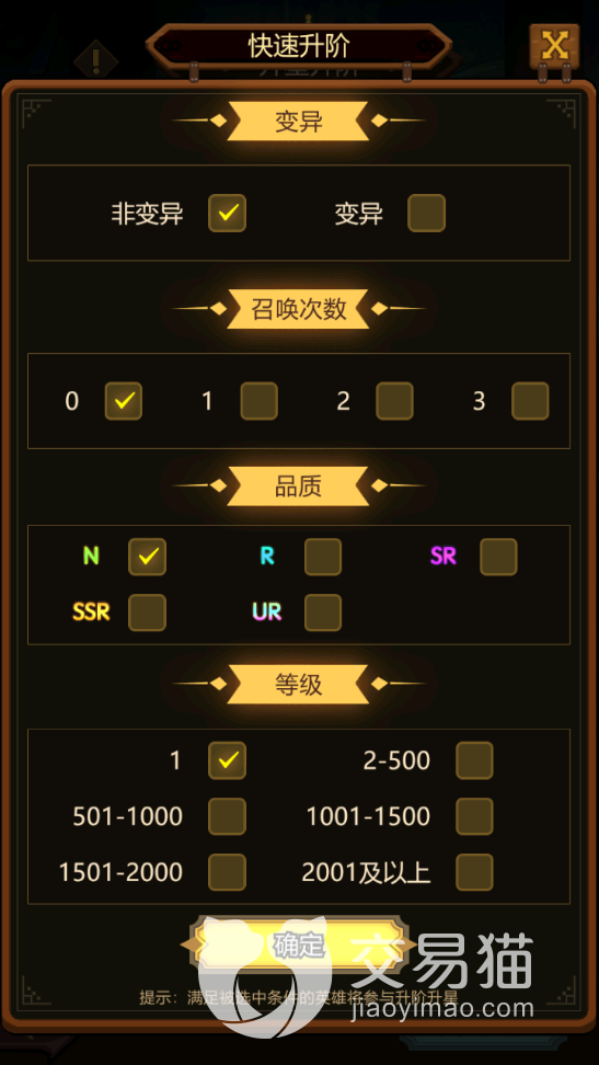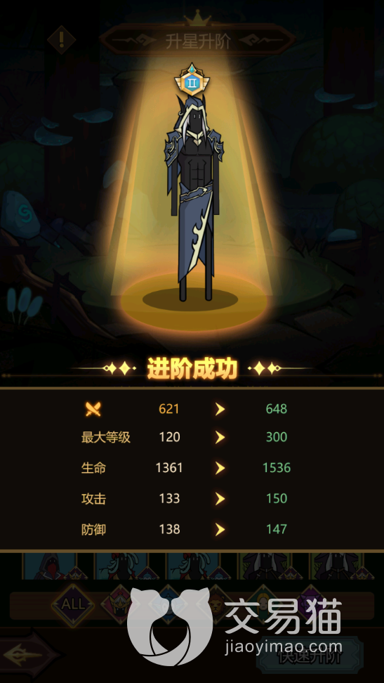 而“快速升阶”则是可以让满足升阶条件的英雄集体升阶,当然,大家也可以通过筛选,去掉现阶段还不想升的英雄。