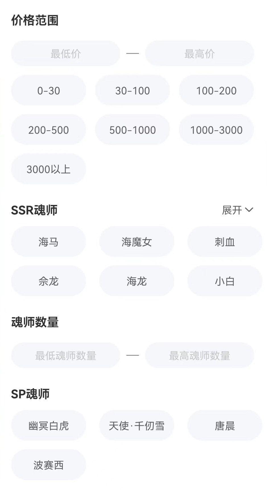 在专区中可以看到有大量账号上架出售,为了在其中快速找到自己需要的内容,平台提供了功能强大且全面的筛选服务。因为游戏中最重要的就是各种顶尖魂师,在筛选的功能里直接就可以选择自己想要的那些人物,逐个点击之后再将其他选项填写上就可以筛选出来。尤其是最重要的SP魂师,更是单独拿出来进行选择。这样一番筛选之后,海量账号就缩小成了很少的一部分,在其中点击进去之后详细再进行查看就可以最终确定了,整个过程耗时很短。