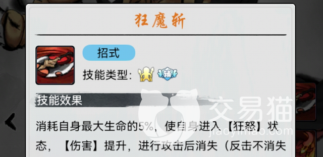 一技能【狂魔斩】该技能在战斗中需要依靠牛魔王自身的生命值进行战斗,牛魔王在出战的时候可以消耗一定的生命值让自己处于狂暴状态,在该状态下,牛魔王随着行动次数的增加进而增加自己的普攻伤害值。
