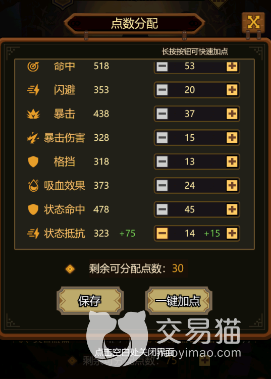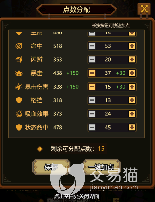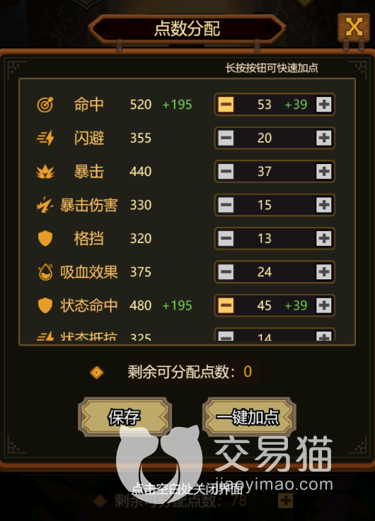 比方说有七十五点的话,可以给攻击留十五点,剩下的大头则交给两项暴击对分,因为前期英雄基础属性不高,也没法强化和穿装备,所以暴击对伤害的收益略高于攻击。