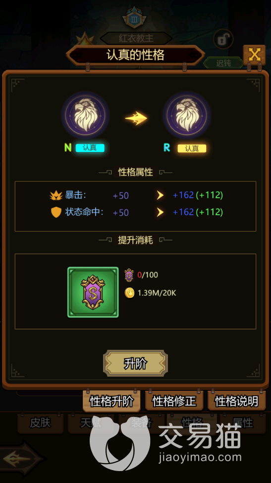 性格和英雄一样,其实也有品质之分,最低级是U,最高级是UR,但它的品质并不固定,玩家可以通过紫色令牌对其进行升级,升级之后,所增加的数值会得到大幅提升。