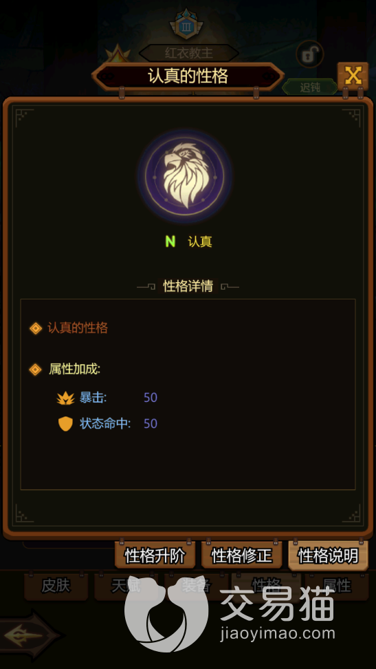 比如下图的“认真”,它可以同时提供“暴击”和“状态命中”两种属性,不过这种好的性格一般只出现在SSR,UR之类的高阶英雄身上。