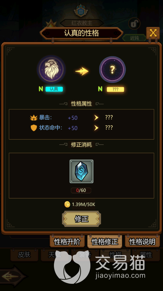 此外,通过消耗蓝宝石,还可以对性格进行修正,这个修正相当于其他游戏里的法宝洗练,既可能令性格所加的属性进一步上升,也可能运气不好让属性下降。