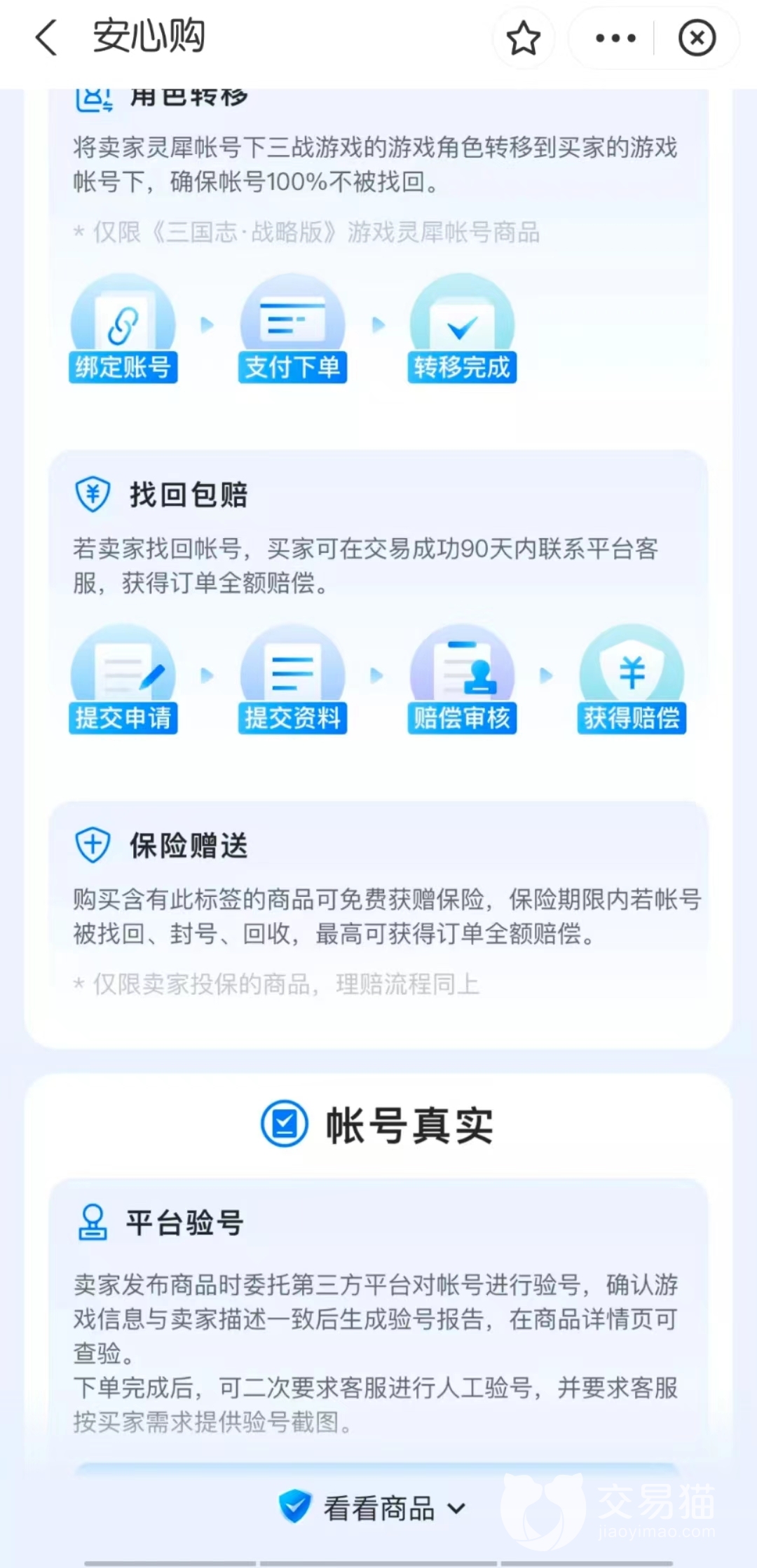 另外,有一些玩家或许会担心,付了钱以后万一卖家通过一些方式找回游戏账号了怎么办,这个也是不用担心的;交易猫平台在卖家上架商品的时候,都会要求实名认证,所以出现这种情况是很少数的;就算有玩家真的找回了账号,交易猫平台还有找回包赔服务,对买家的损失进行赔偿。
