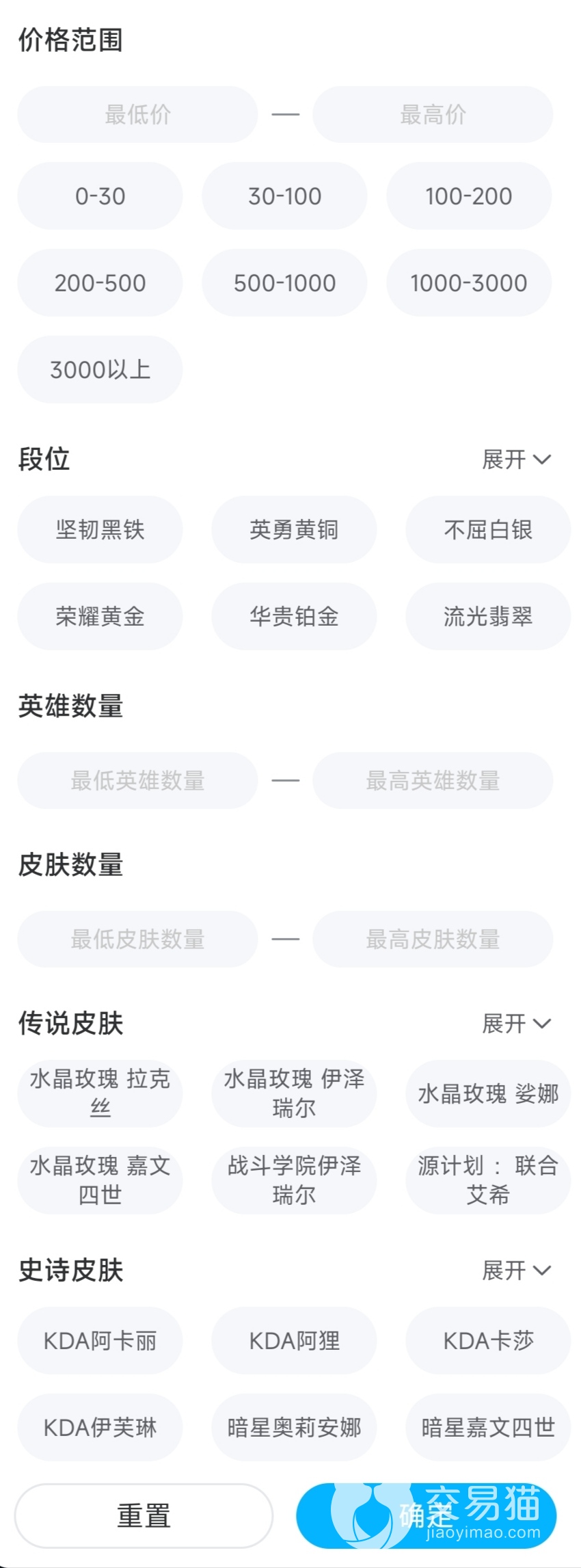 交易猫将不同游戏的订单都划分开来划入该游戏的专区,方便有需求的买家能够第一时间找到专区进行挑选。再者交易猫在专区内有针对此游戏的筛选界面,有定向意愿的消费者可以用筛选功能来快速定位。例如英雄联盟手游的筛选界面就可以选择价格区间、英雄数量、传说皮肤、史诗皮肤等内容,所以想要自己的订单能够快速找到买家,那就一定要把订单详情填写清楚。