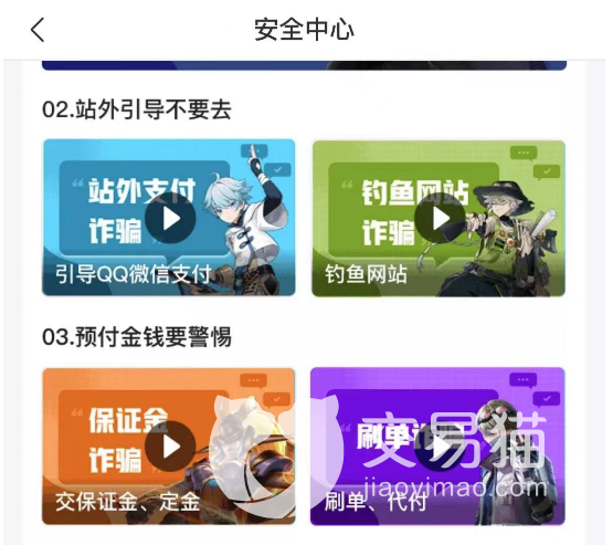 不管是在哪个层面,对于用户来说安全都是最重要的,不单单是在游戏交易网站,对于一些新用户就显得更为重要了,在交易猫的安全中心,可以学习到很多安全方面的教学视频,帮大家避免了一些常见的骗局,包括站外引导支付、预付定金保证金、刷单等,直接运用到交易中,包括发现异常后的举报功能,都是为了让大家都能得到优质的服务。