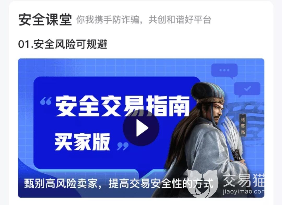 交易猫的安全中心是一个携手防诈骗的入口,非常建议交易小白把这些安全交易指南以及骗子可能在平台内行骗的形式全都给大家模拟重现了一遍,这样自己在买账号之前就能有一个心理准备,遇到骗子也能够及时的甄别并且做出应对。