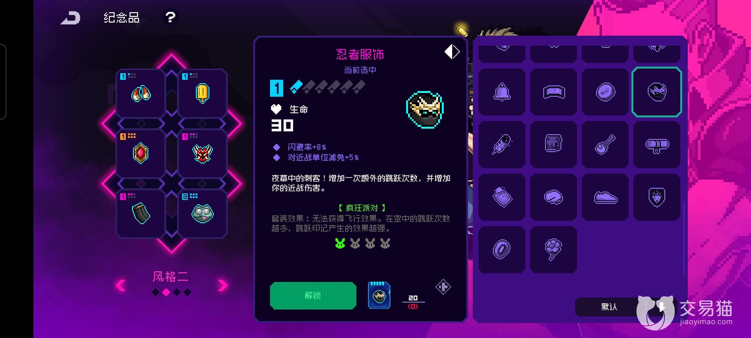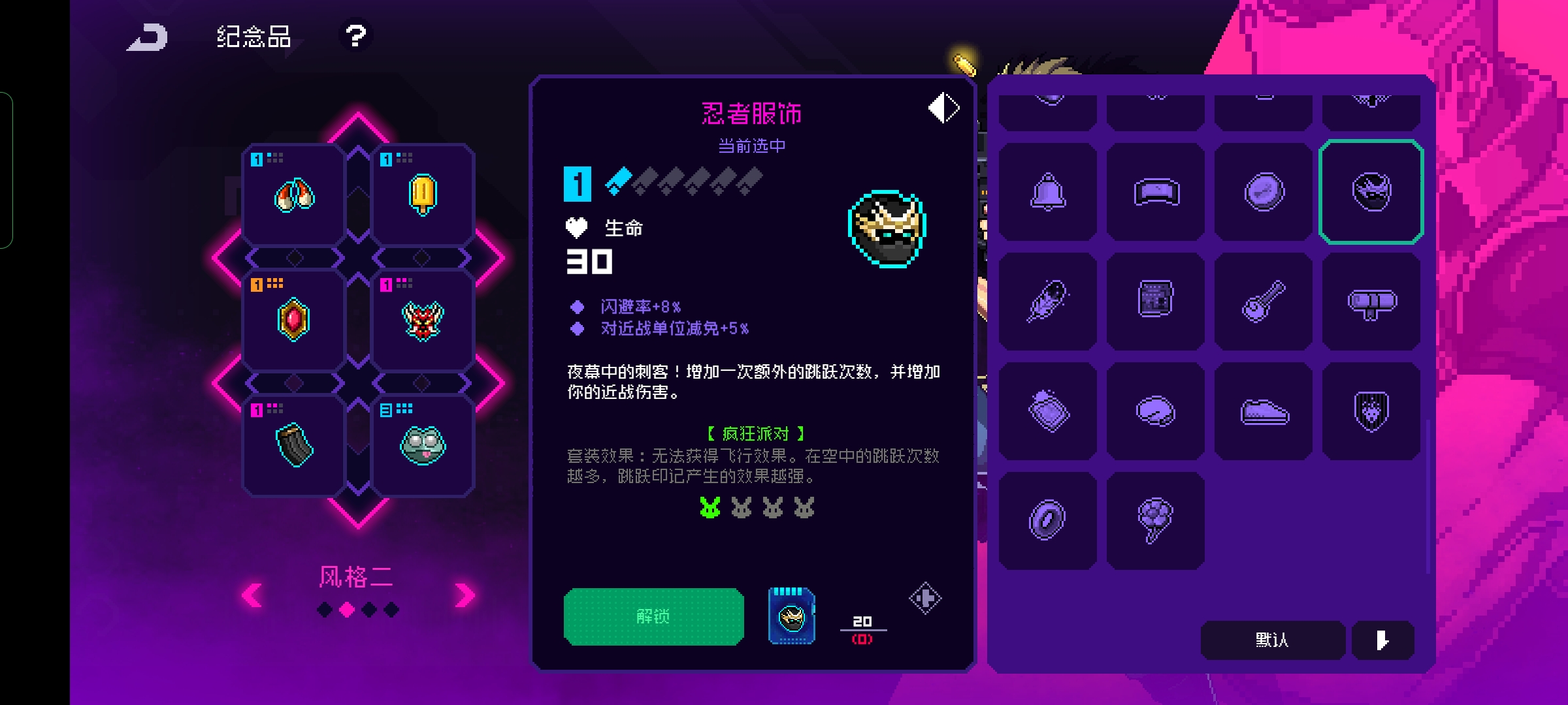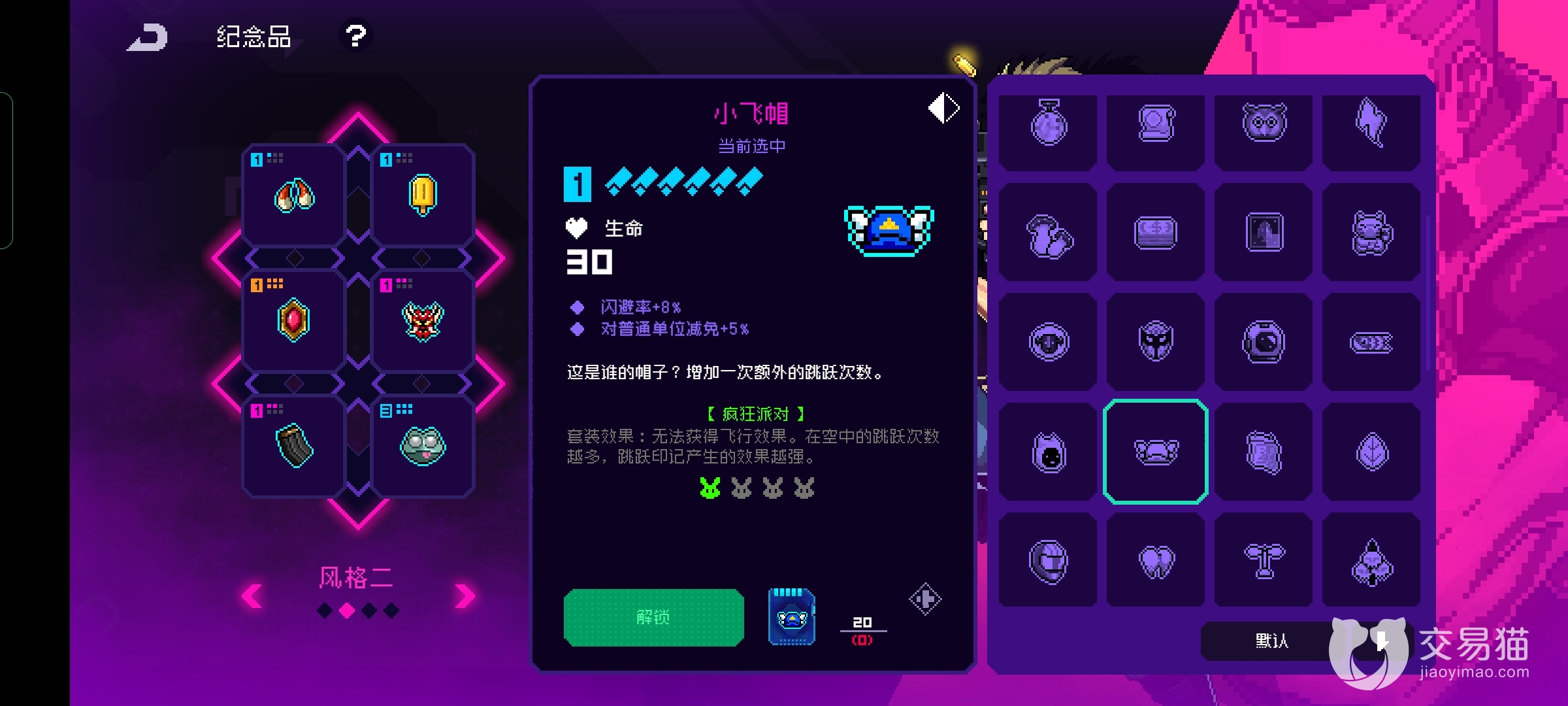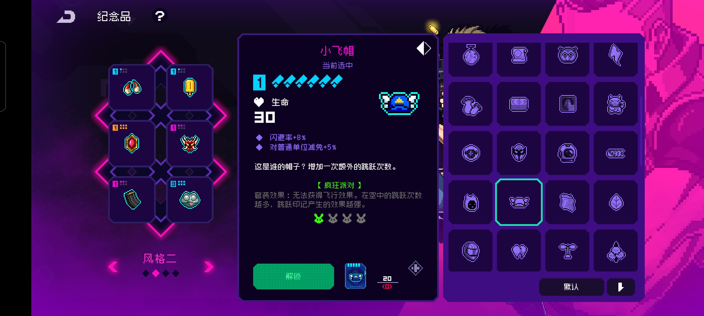 然后可以在一些蓝色的物品中找到让玩家跳跃增加一次的道具,例如小飞帽就是玩家初始携带的物品之一,这个道具还有闪避的效果非常的好用。例如傻青蛙还有忍者服饰,还有电子绵阳以及鲤鱼旗这些东西的效果都是增加一次跳跃效果,并且玩家获取多个道具的时候效果是可以叠加的,玩家甚至能够跳到最高的天花版,手游跳跃的时候是可以自动攻击的,所以跳的的越高越安全还能顺便清怪。