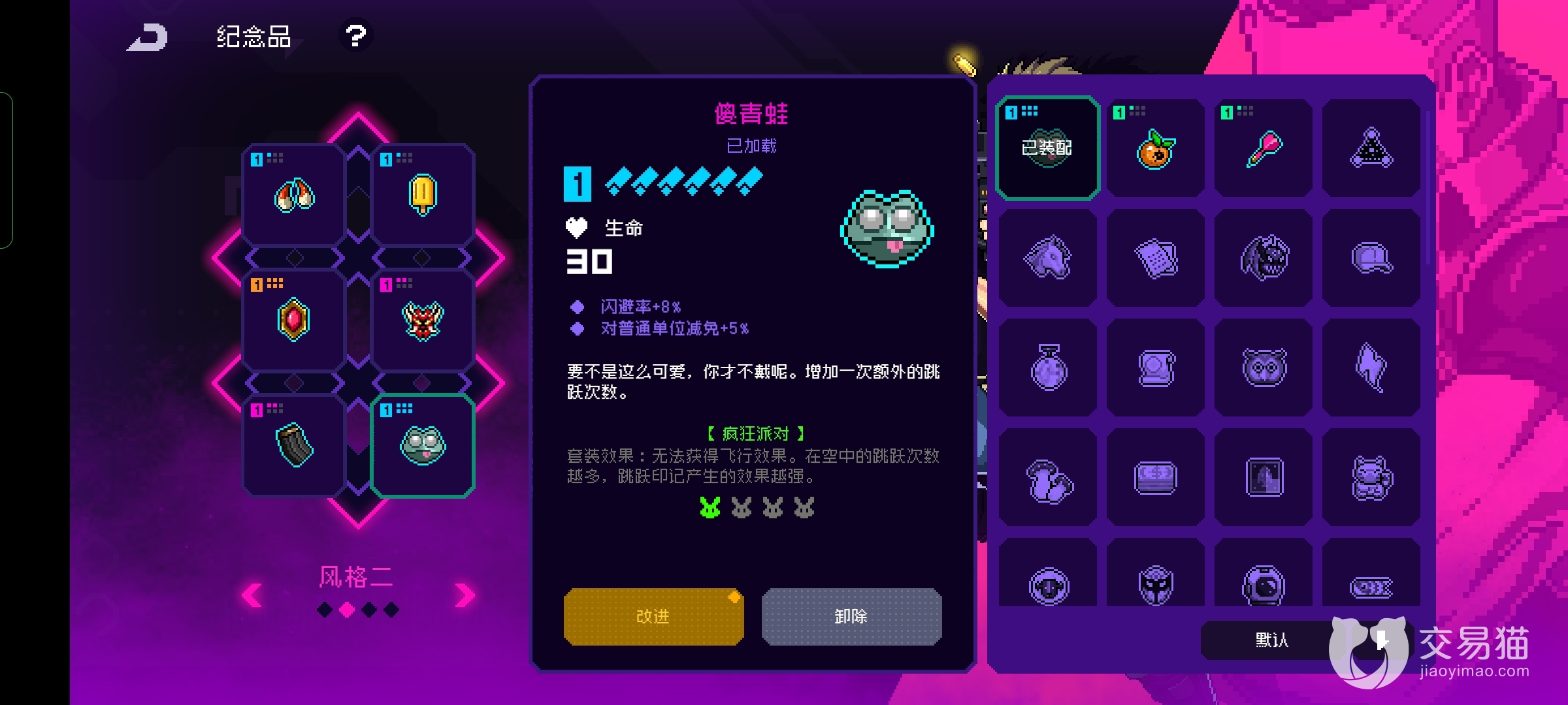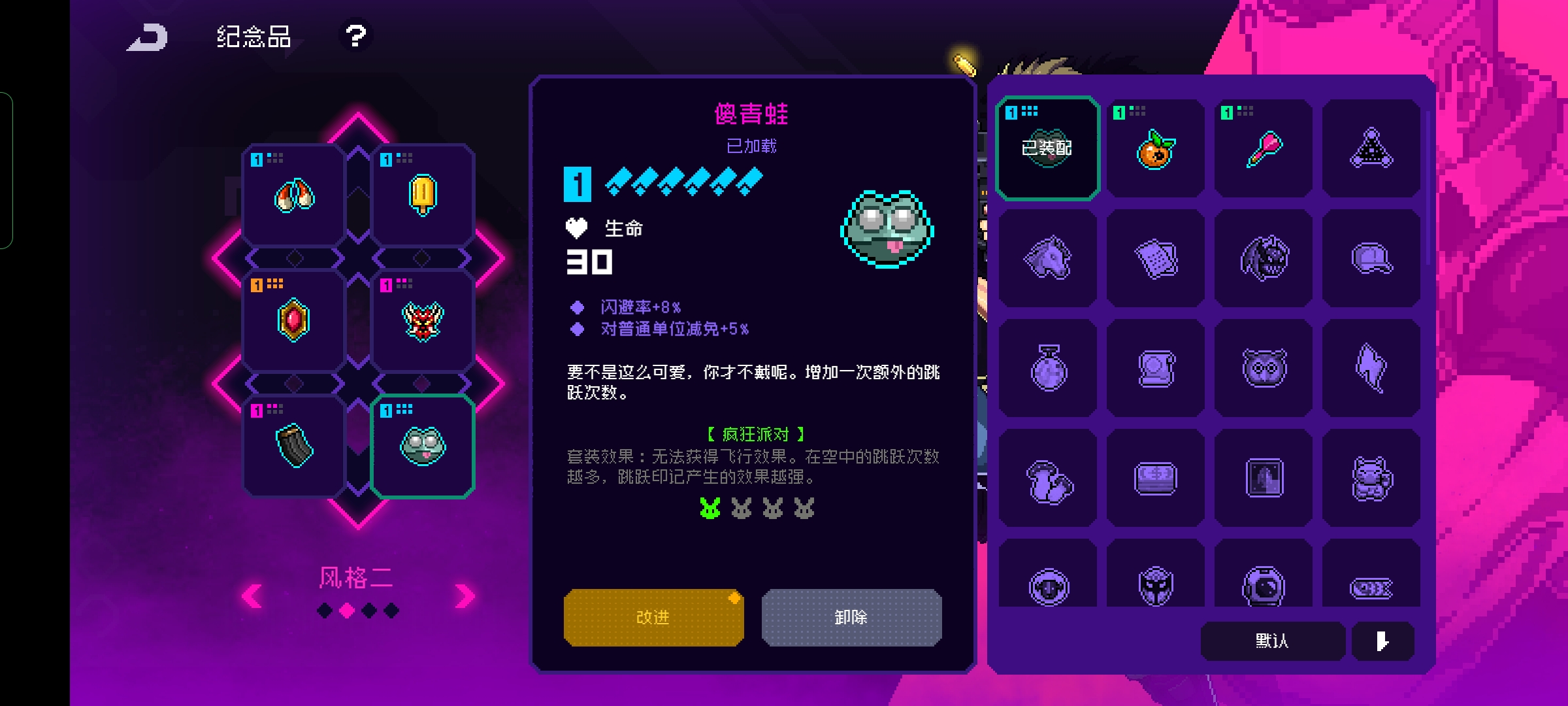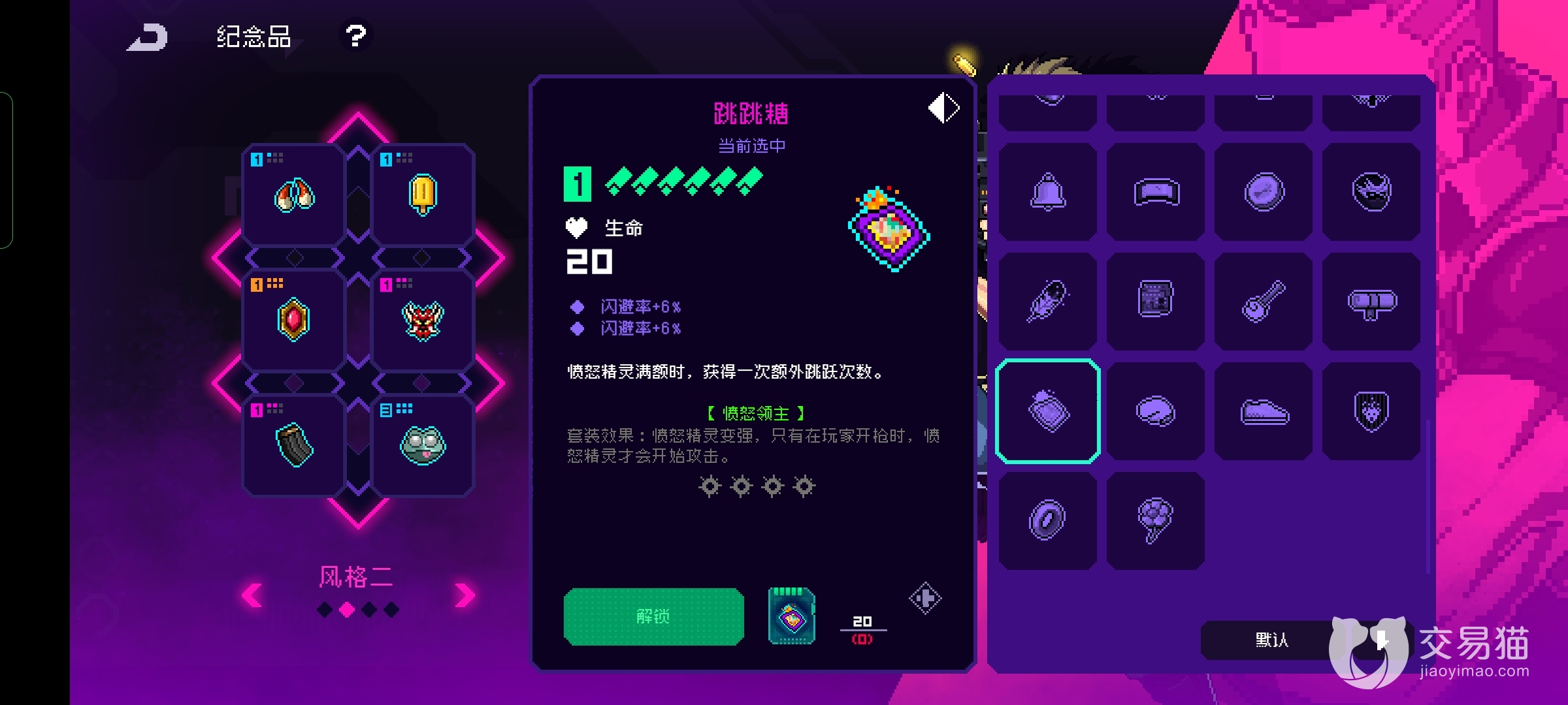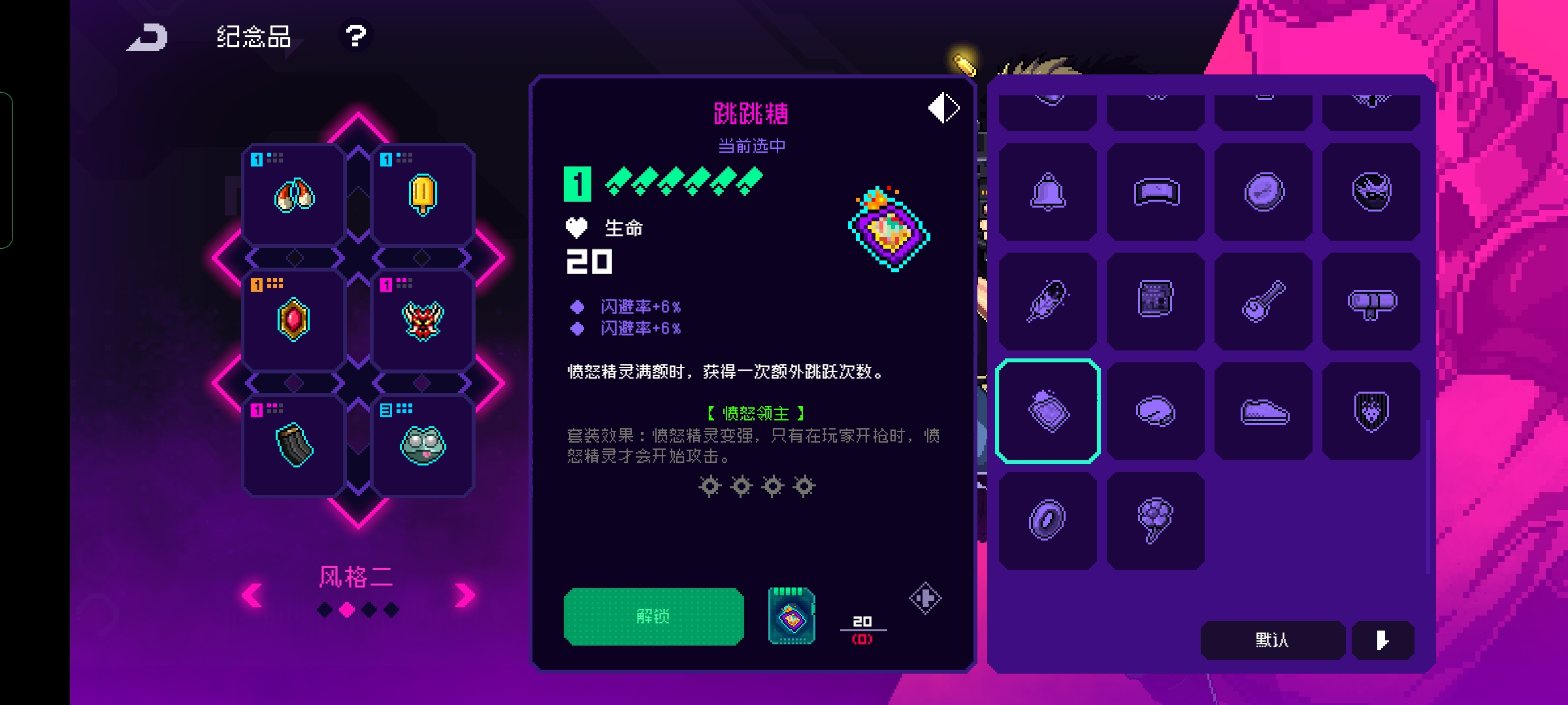 首先能让玩家获取二段跳跃能力的就是跳跳糖了,但是需要配合愤怒精灵才能发挥效果所以玩家一般发动能力比较的复杂,但是品质是绿色很容易获取。