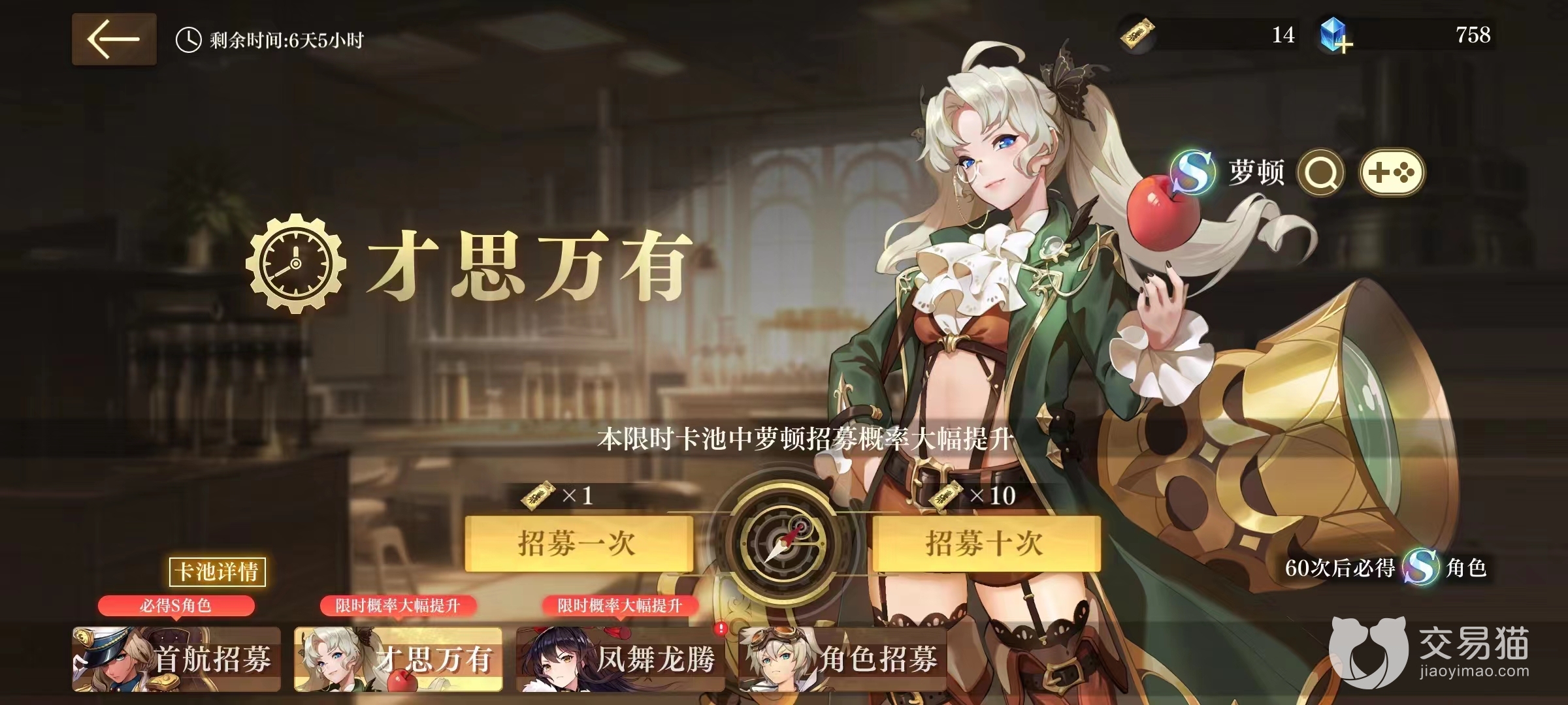 这个新人卡池是比推荐新手前期去抽取的,玩家前期的角色只有两个A级的翠西亚、伊桑和B级的禄安,能获得一个s级的角色对新手玩家提升是非常大的,而且这个卡池概率提升的s级角色都是比较实用。