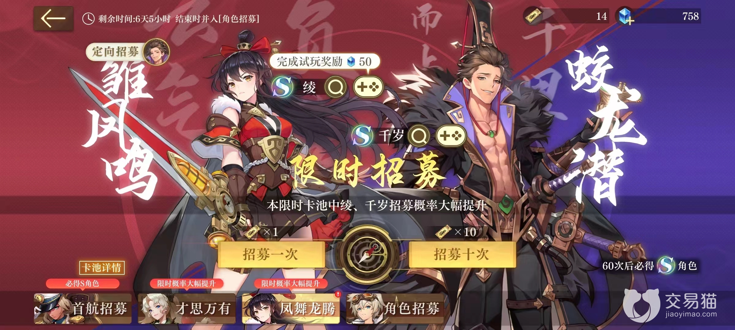 凤舞龙腾是一个可以定向招募的卡池,玩家可以定轨自己想要的角色,每60抽就必定可以获得定轨的角色。这个卡池概率提升s级角色是绫和千岁,千岁他在攻击时会随机同时发射飞剑来追击敌人,飞剑的伤害与千岁的生命值挂钩,生命值越高飞剑伤害也高。