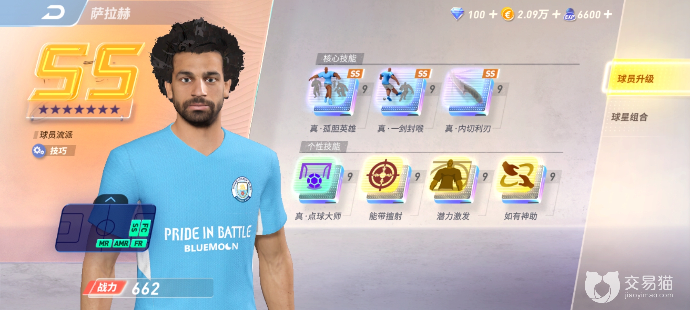 第二个要给大家推荐的角色就是萨拉赫,这个角色的话绝对是一个非常强大的角色,属于SS级角色,不过他的属性面板稍稍弱一些,主要依靠技能进行战斗,他在带球射门方面拥有非常强大的实力,而且点球的概率也是游戏内最强的,玩家如果使用它进行前锋的话,可以快速的发起进攻,而且整个队伍的实力也将快速的提升,拥有百分之一百零四的带球成功率,可以说这个数值在游戏内基本上无人能比了。