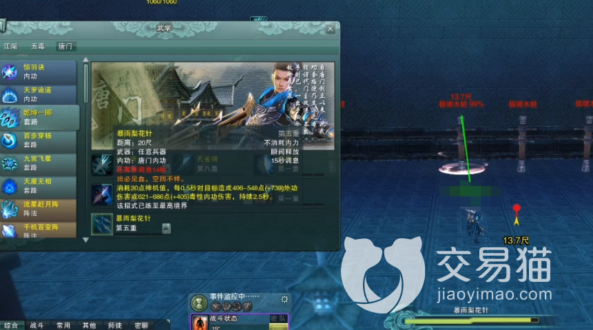 暴雨梨花针:充能两层,无需武器释放,读条2.5秒,每0.5秒造成一条小伤害,秘籍中附带每次释放获得气魄buff,提高自身属性,常规下该技能就只为获得此招式秘籍的属性加成。