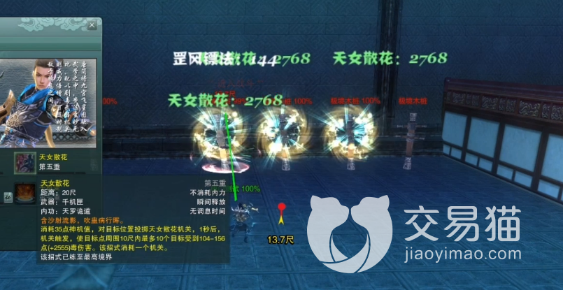 天女散花:无调息,对目标处释放一个机关,延迟0.5秒后,对目标及其周围生成内造成小伤害并施加化血Dot。化血Dot每三秒造成一条小伤害,在无读条环境或对方无Dot下,优先使用该技能挂Dot和打伤害,在需要AOE群攻时也会用该技能来造成小群伤。