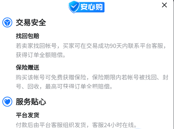 在游戏交易中的,玩家们最担心的就是该笔交易的安全性, 在该平台内有安心购服务,在该平台上架的所有游戏账号都是经过平台官方验证之后的,在交易的过程中各位小伙伴们还能申请平台客服进行第二次人工验号,实时反馈该账号的具体详细情况。
