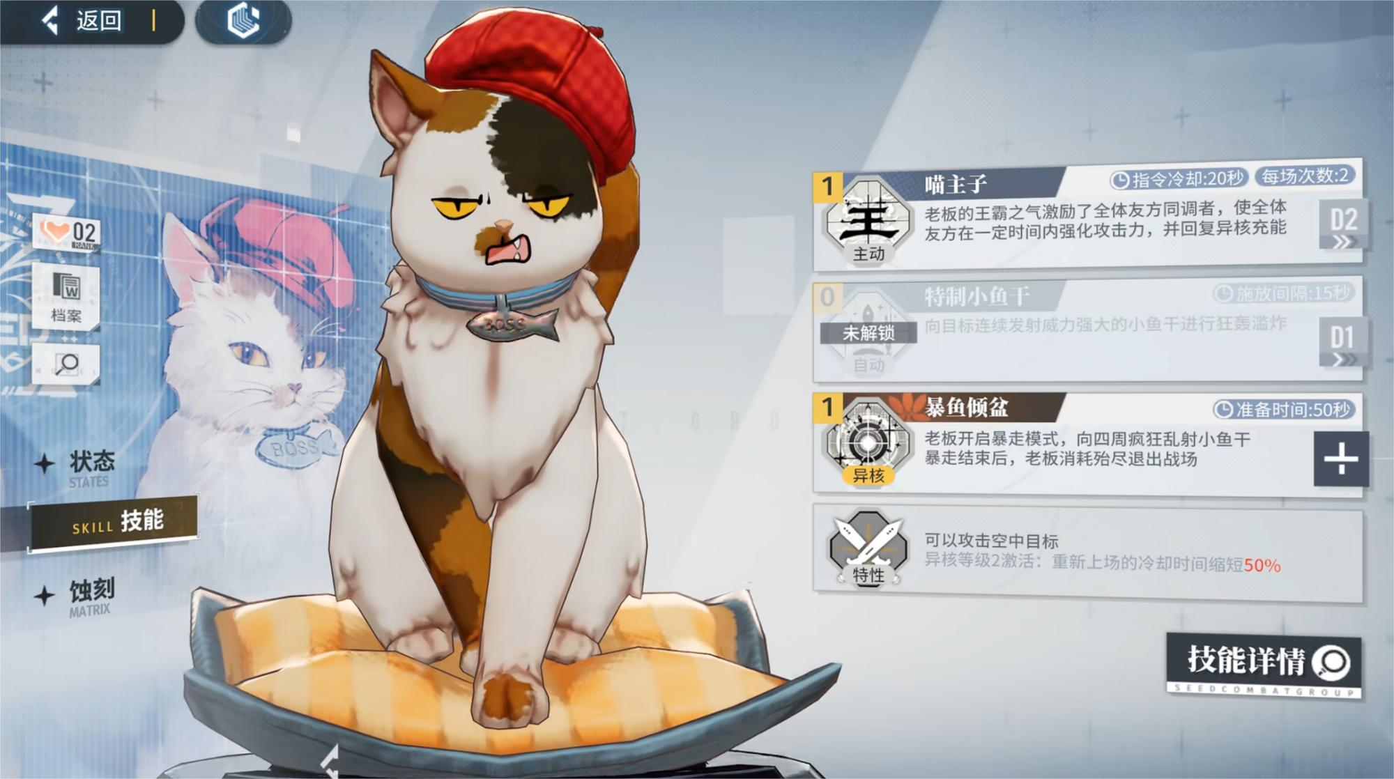 主动技能喵主子,二十秒的冷却时间可以给全部在场的队友增加攻击力上升的buff并且还能恢复异核充能,该角色核心技能就是这个,自动攻击释放出特质的小鱼干攻击敌人属于远程的攻击效果。