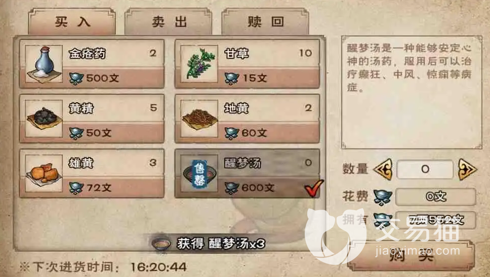 在游戏,玩家们在进行庖丁获得虎骨的时候会消耗一定的体力,这个时候就需要注意不要把所有的体力都刷虎骨上面了,可以多留一点体力去越级刷取装备,然后在游戏内完成主线任务“华十三处买梦醒汤”的时候,玩家们只要不交该任务就可以每天活得购买三个的资格,需要购买两天在后期就完全够用了。