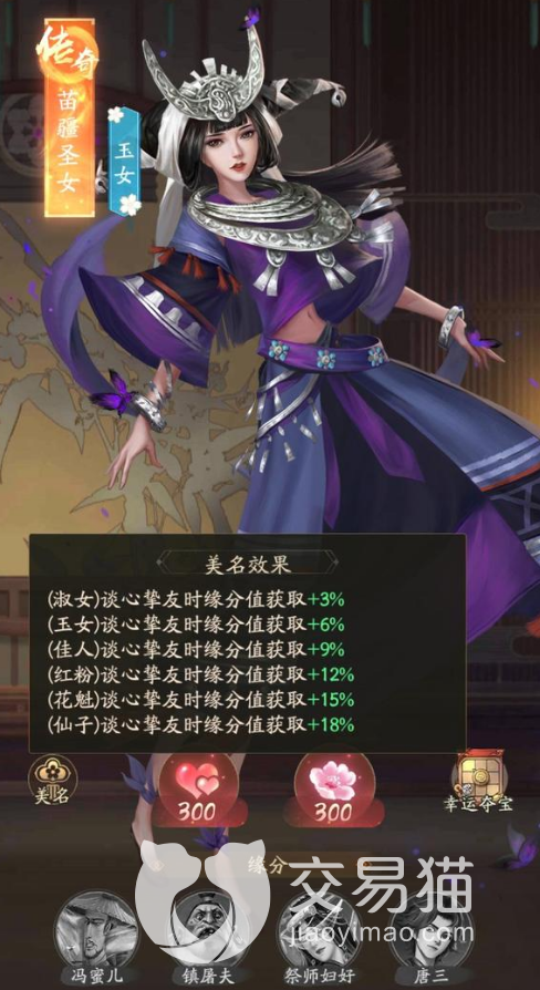 2、之后就是苗疆圣女,因为她和屠夫是有一定的羁绊,两个人同时上场还会触发一些新的奖励加成。