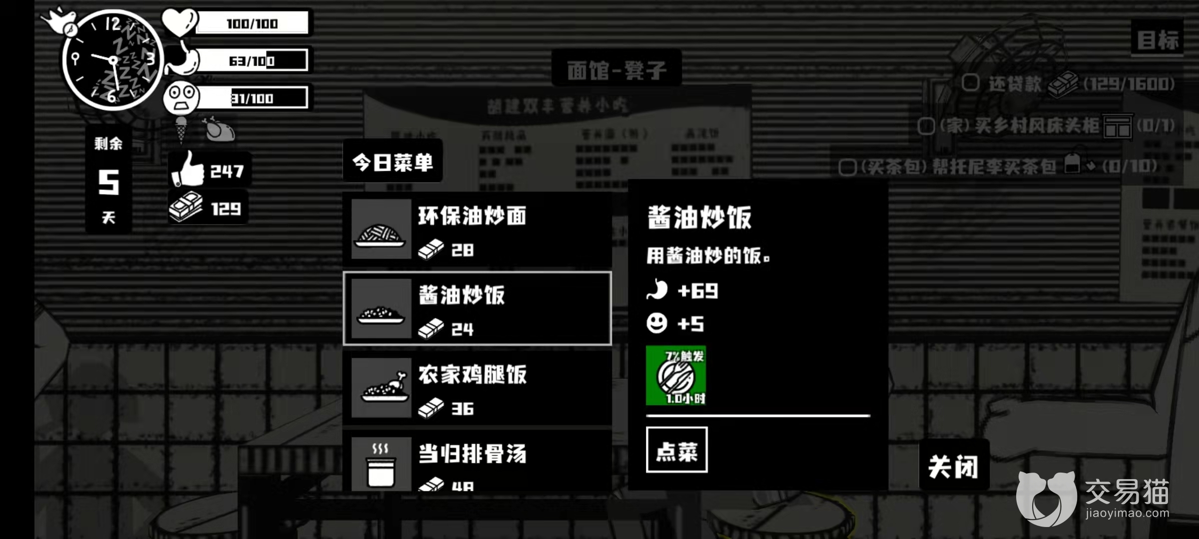 最后就是饱腹值掉光时的这种情况,这个建议大家也是对症下药,最好的方法就是去双峰面馆点上两份酱油炒饭把饱腹值回满从而停下健康值的流失,炒饭不仅便宜管饱,还有7%几率获得“美食”状态,此状态下健康值会每秒提升一点,持续时间相当长。
