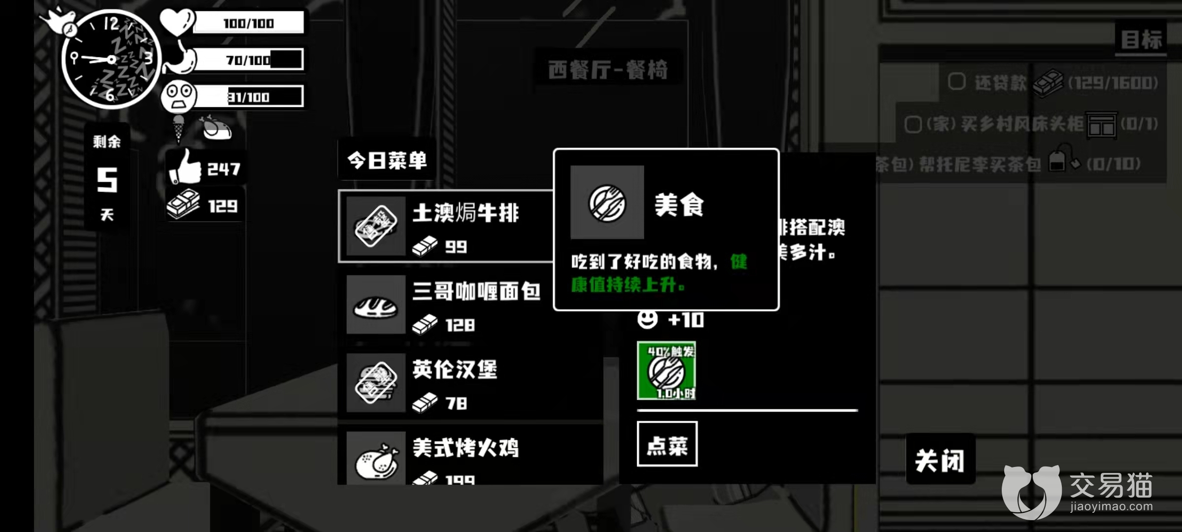 此外,如果有条件去西餐厅最好进食高档食品,玩家有会有更高的几率获得“美食”状态!