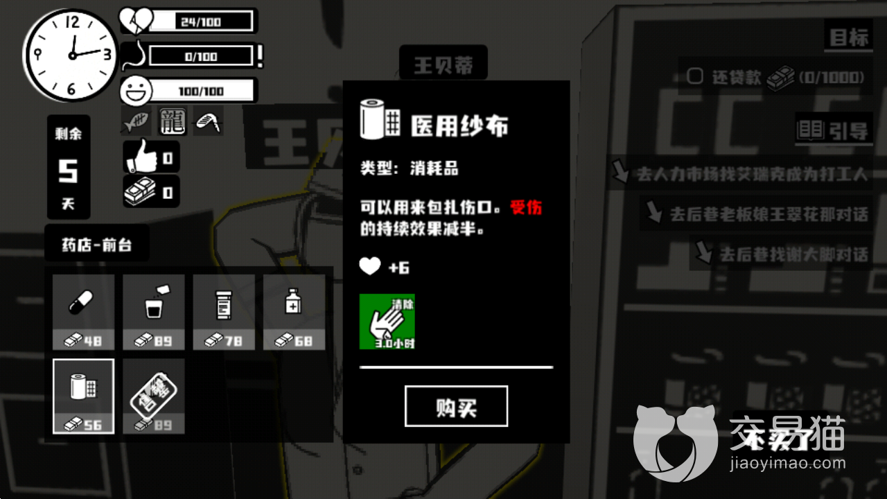受伤的话,也可以去药店处理,那里有纱布售卖,买上一个使用即可,纱布也会提升少许健康值,不过价格较贵,高达56块。当然,大家平时只要注意别去后巷逗流浪猫,然后少参与危险性大的工作,基本就不会受伤。
