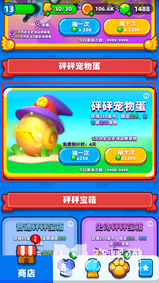 想获取高品质宠物还是得靠抽蛋,宠物蛋的抽取可通过左下角“商店”选项进入,十连抽必出史诗品质。