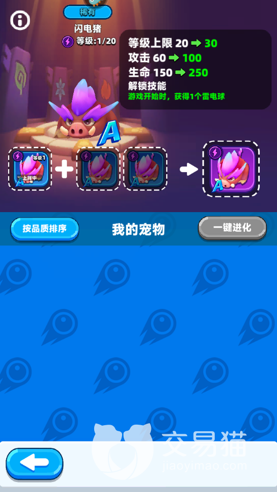 那如何才能让宠物的品质达到要求呢?答案是进化,这个东西与装备合成类似,低级的宠物想进化成高级品质的,需要消耗两个和它一样的另外两个宠物。
