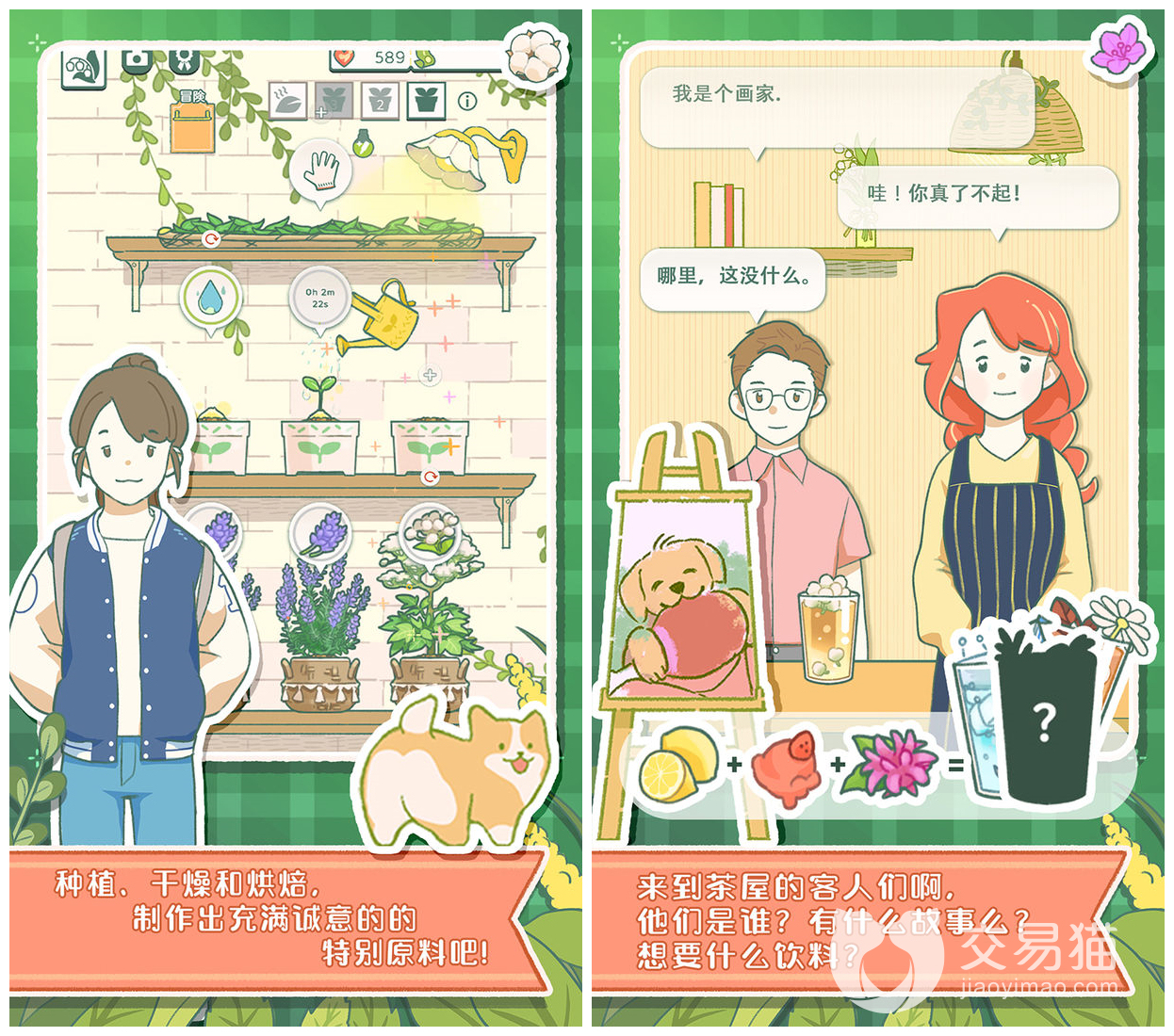 在游戏里面玩家开启一家治愈小茶屋,整理好店面就能开店迎接客人。客人到达之后会提出各种要求,玩家通过直接购买茶叶或者亲自种植茶叶,获得茶饮的原材料。