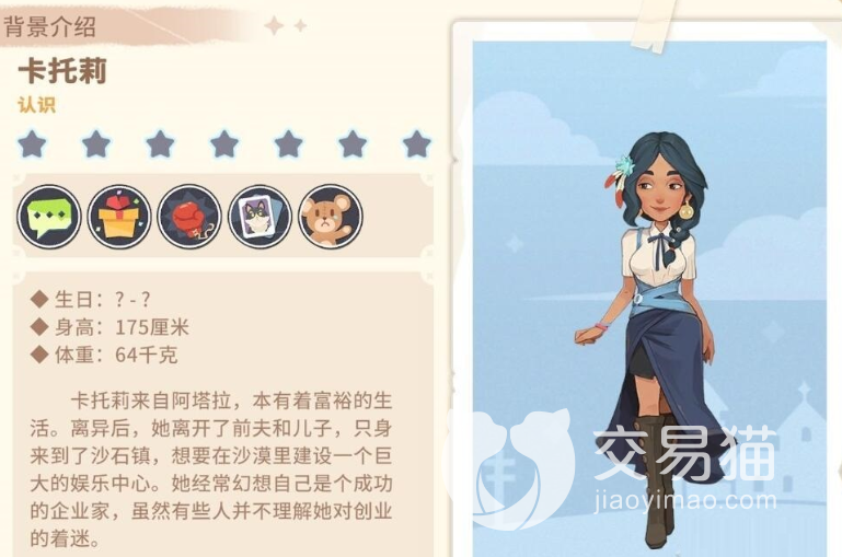 卡托莉在游戏里是当地有一定声望的投资者,企业家,一般情况下会在博物馆出现,因为她也是博物馆的老板,博物馆的营业时间实在早上7点到晚上18点,过了这个时候就很难找到卡托莉了,因为她此时要么回家了,要么就是在小镇的其它地区溜达,根本没有固定的行动路线,所以要注意选择时间。