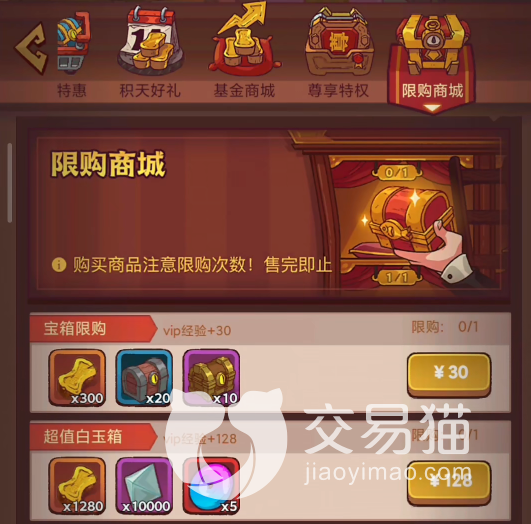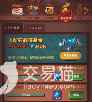 玩家首先可以进入基金商场,在这里会有进阶石基金1和2,小编的建议是,这个基金可以留到后面去买,因为它是有领取限制的,需要通关多少才可以领取,而且才了一般都在后期会比较缺,前期可以买限购商城里的东西,一般情况下微氪的话其实买个30的或者月卡其实也是够用的。