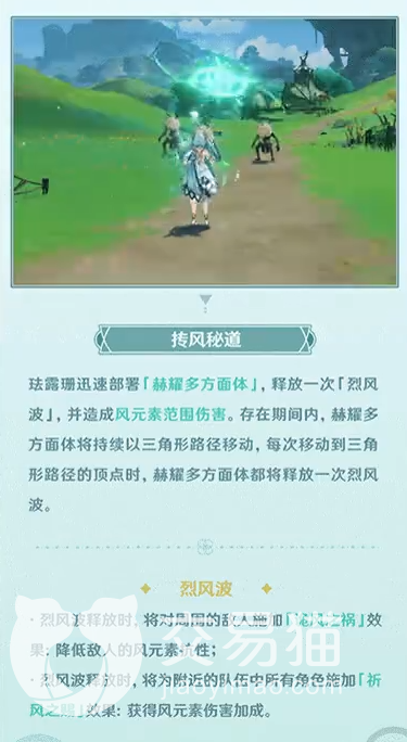 大招抟风秘道的效果是释放一个以三角形移动的多面体,每移动一次都会造成风属性aoe,技能本身伤害倒不算强,强就强在它的技能会降低敌人风抗的同时,增加己方的风元素伤害,这就大大提高了风阵营角色的伤害,可以说非常好用。