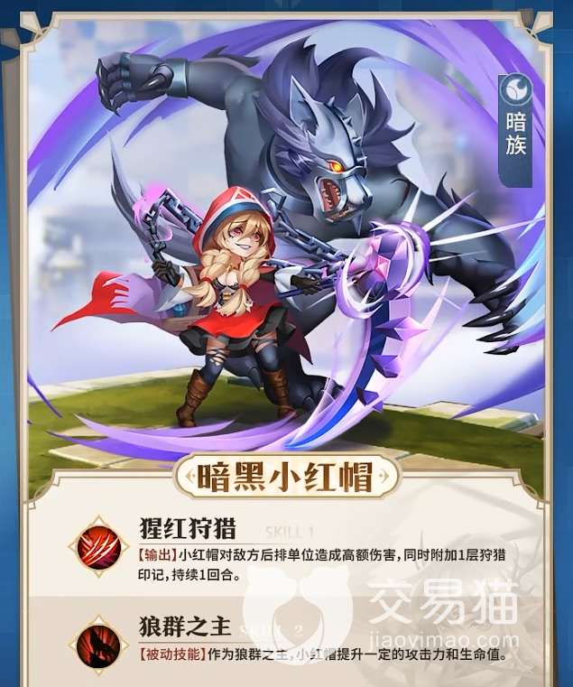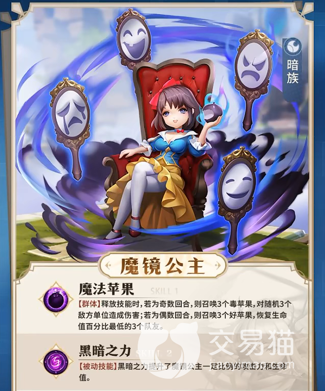 首先是暗族的两个角色,魔镜公主和暗黑小红帽,首先来说说魔镜公主,她是一个群攻职业,技能“魔法苹果”可以在释放技能时对敌方三人造成伤害,或者对己方三名生命值最低的队友进行治疗,再来说说暗黑小红帽,她是一个输出职业,她的技能“猩红狩猎”可以让她对后排敌人造成高额伤害并且给其附上一回合的狩猎印记。
