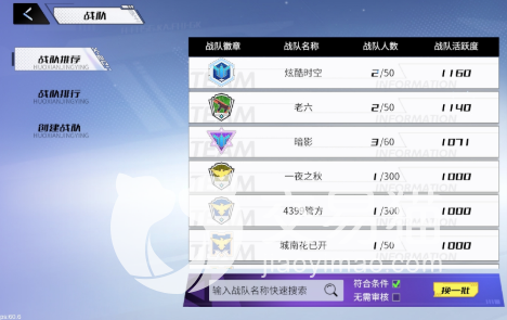 进入到战队系统之后,玩家能够看到战队推荐、战斗排行还有创建战队三个不同的选项,战队推荐的战队一般都是能够直接加入不需要满足额外的条件就可以申请加入,一般都是新创建的战队,虽然人数比较低,但是还是比较适合萌新加入的。