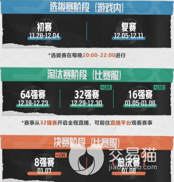该活动一共有三个阶段,需要玩家进行报名,有选拔赛还有淘汰赛决赛的比赛,选拔赛在游戏正式服进行选拔,每次选拔的时间在晚上八点到十点左右,淘汰赛决赛则是在专用比赛服。