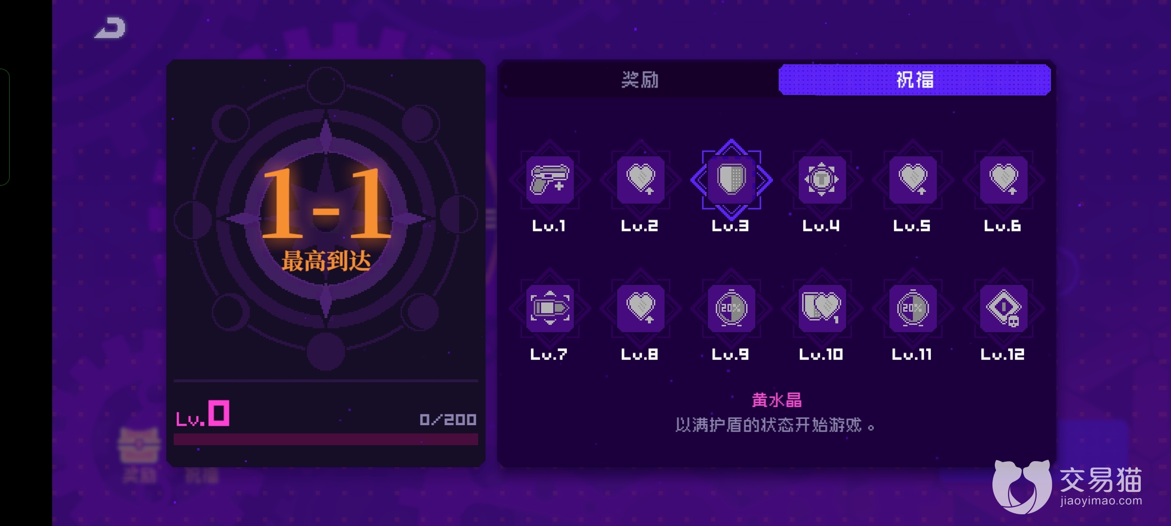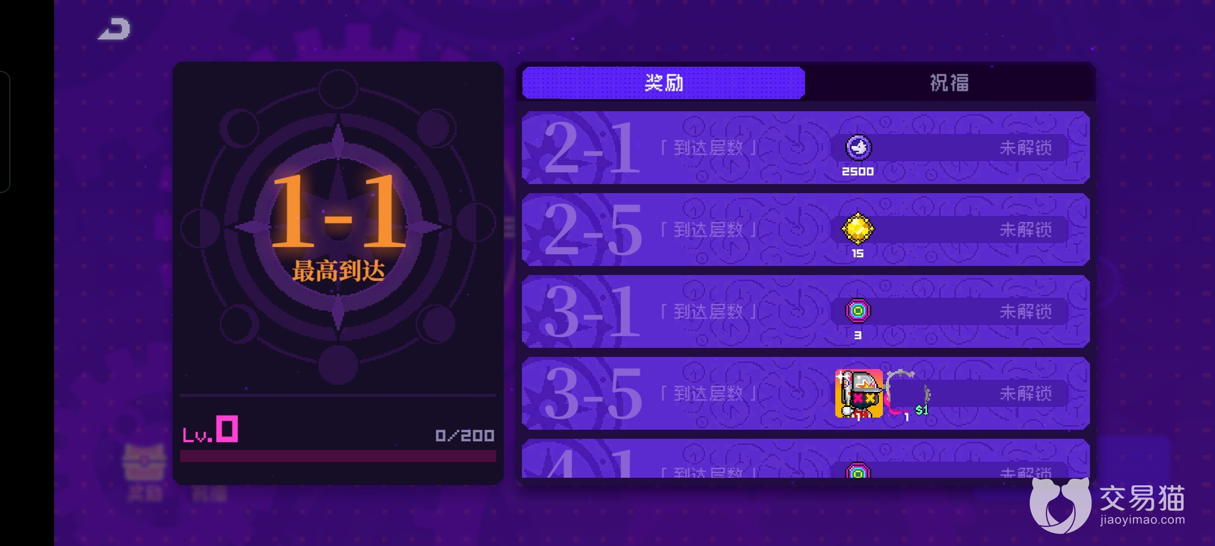 游戏会显示玩家到达的最后关卡,并且游戏里面挑战会有经验,升级之后可以解锁祝福,总共是有12个祝福的效果的,第一级的效果【粉晶石】初始耳朵房间会随机有一把武器,第二级【石榴石】总血量增加20%,第三级【黄水晶】护盾会在开局全满。第四级【七彩石】爆炸击败怪物会有额外金钱,第五级【橄榄石】再加20%血量,第六级【蓝海石】效果和前一个相同20%血量,第七级【虎眼石】四发子弹召唤一个爆弹,第八级【尖晶石】也是增加20%红心,第九级【天青石】减少20%技能冷却,第十级【芬达石】一个大关卡攻略会将你的状态回满,第十一级【葡萄石】减少20%技能冷却,第十二级【月亮石】每过一层增加1%的伤害。根据这些祝福其实就可以开始挑选闯关的角色了,三级的祝福开启对于依赖盾牌的角色来说就是最强的buff,例如r6以及光头这两个角色都是不怎么依赖血量的蓝盾角色,如果你够肝开到十二那么游戏其实也就没啥难度了。