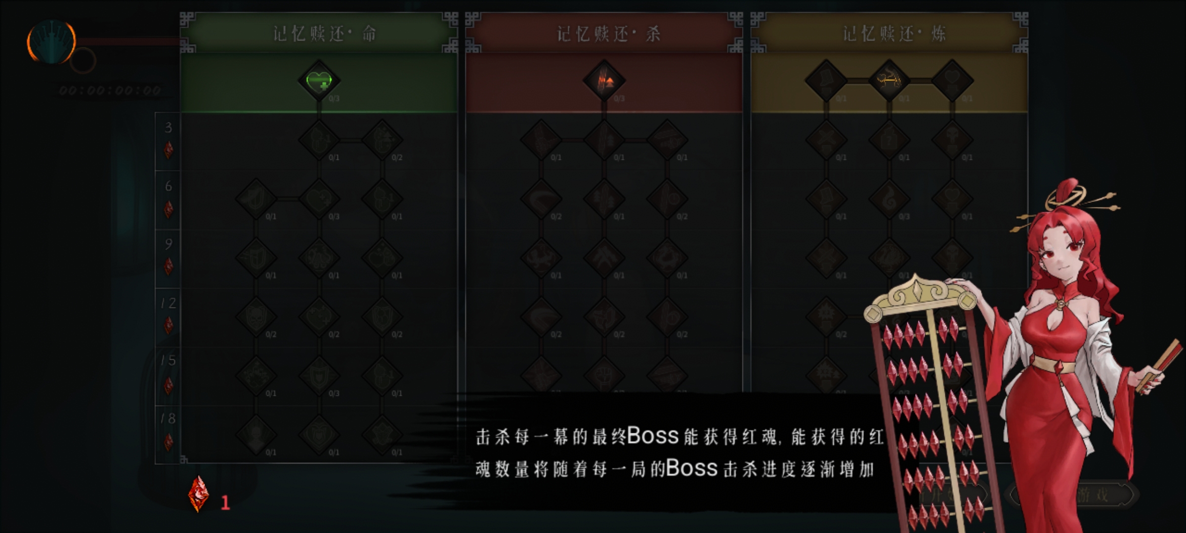 回到基地第一件事就是开始看一看自己的红水晶收集多少了,在狭间当铺可以看到自己的技能选择,有绿色红黄三色,绿色主要增加玩家的生命,还能让玩家携带的酒葫芦多一点恢复的量多一点,红色增加玩家的初始伤害,黄色能让玩家开到的道具变得更好,甚至还能解锁炼化的功能让多余的圣物增加玩家的属性。建议是从左往右的解锁,也就是先生命后攻击最后解锁加概率的功能天赋。在家里还要整理一下自己的异闻录收集情况,以及圣物和武器收集的册子这些都是很重要的东西,后期作用每一位老玩家都知道,新玩家可能还是比较的懵的。